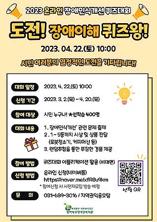 https://naver.me/xfR8u9km)을 통해 참여신청을 할 수 있고, 퀴즈대회에 대한 자세한 내용은 평택북부장애인복지관 지역권익옹호팀(☎ 031-689-3016)로 문의하면 안내 받을 수 있다.
