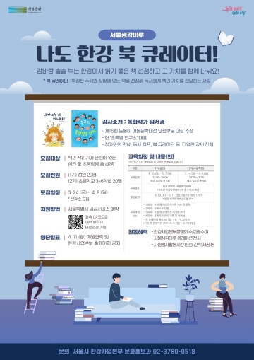 모집 기간은 3월 24일(금)부터 4월 9일(일)까지 이며 서울특별시 공공서비스 예약 누리집(yeyak.seoul.go.kr)에서 ‘북 큐레이터’를 검색 후 접수하면 된다. 보다 자세한 사항은 한강사업본부 누리집(hangang.seoul.go.kr)을 통해 확인할 수 있다.