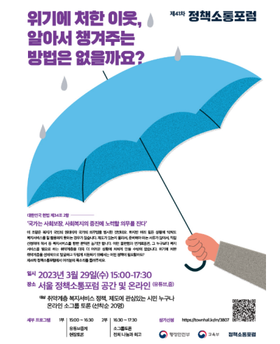 행정안전부와 교육부는 ‘위기에 처한 이웃, 알아서 챙겨주는 방법은 없을까요?’라는 주제로 3월 29일(수) 오후 3시, 정부서울청사 별관 1층 정책소통포럼 공간에서 ‘제41차 정책소통포럼’을 공동 개최한다고 밝혔다.