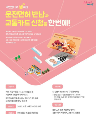 서울시는 「고령 운전자 면허 자진반납 간소화 서비스」를 통해 어르신들의 면허 반납과 교통카드 수령 과정을 더욱 편리하게 지원하고 있다. 면허 반납을 원하는 어르신은 주민센터에서 면허 반납 신청부터 교통카드 수령까지 한 번에 가능하다.