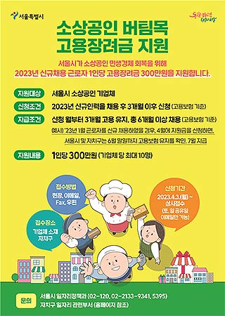 「소상공인 버팀목 고용장려금」사업은 서울지역 소상공인이 ‘23년 신규인력을 채용할 경우 1인당 3백만원을 지급, 총 61억원의 예산을 투입하여 약 2천명의 신규채용 인건비를 지원한다.