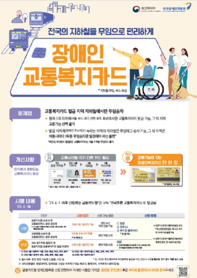 또한, 교통카드 기능이 있는 장애인등록증을 발급하는 지역이 종전에는 서울, 부산, 대구, 광주, 인천, 충남 등 6개 시·도로 한정적이었으나 2023년 4월부터 ‘교통카드 기능 있는 장애인등록증’을 ‘전국에서’ 발급받을 수 있게 된다.