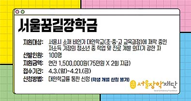 • 서울장학재단(이하 재단)이 교육지원이 부족한 학교 밖 청소년들도 꼼꼼하게 지원 혜택을 받을 수 있도록 초·중·고 비인가 대안학교에 재학 중인 청소년을 대상으로 <서울꿈길 장학금>을 지원한다.