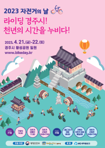 행정안전부는 올해 경주시와 공동으로 「2023 자전거의 날 행사」를 4월 21일(금)부터 4월 22일(토)까지 이틀간 경주시 황성공원 일대에서 개최한다고 밝혔다.