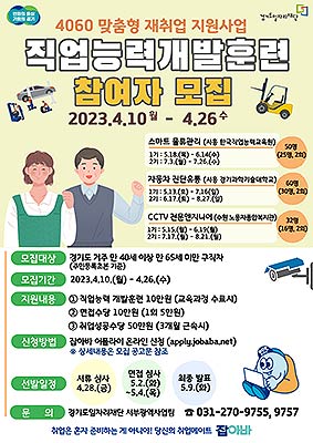 경기도가 중장년 재취업 지원을 위해 직업능력개발훈련부터 취업 연계 서비스까지 제공하는 ‘맞춤형 직업능력개발훈련’ 참여자 142명을 4월 10일부터 26일까지 모집한다.