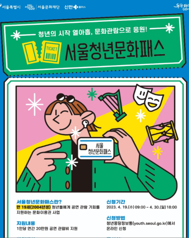 서울시는 4월 19일(수) 9시부터 4월 30일(일) 오후 18시까지, 만19세(2004년생) 청년들에게 연 20만원의 문화이용권을 지원하는 ‘서울청년문화패스’의 신청 접수를 시작한다.