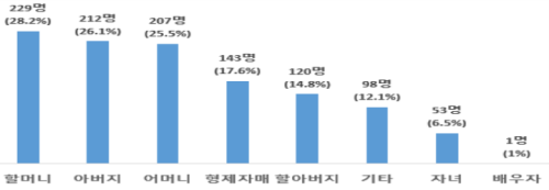 가족 중 돌봄대상자는 (외)할머니(28.2%, 229명), 아버지(26.1%, 212명), 어머니(25.5%, 207명) 순으로 높게 나타났고, 돌봄 대상자가 여러 명이 있는 경우도 있었다.