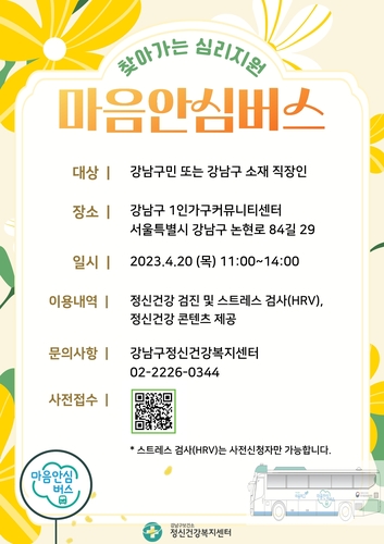 꿈이 모이는 도시, 미래를 그리는 강남구(구청장 조성명)가 20일 11시∼14시에 강남구1인가구커뮤니티센터에서 찾아가는 심리지원 '마음안심버스'를 운영한다.