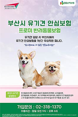 부산시(시장 박형준)는 내일(21일)부터 부산시 소재 유기동물보호센터에서 유기견을 입양한 가족에게 1년간 펫보험을 무료로 지원하는 ‘2023년 유기동물 펫보험 지원사업’을 시행한다고 밝혔다.