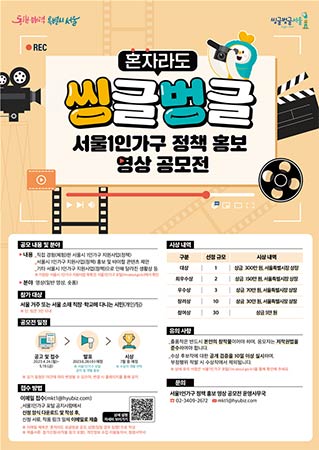 서울시는 ‘혼자라도 씽글벙글~’ 1인가구 정책홍보 영상 시민 공모전(이하 ‘공모전’)을 4.24.(월)부터 5.19.(금)까지 개최한다고 밝혔다.