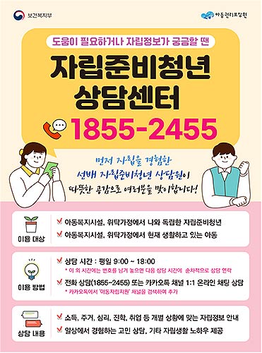 보건복지부(장관 조규홍)는 자립준비청년이 아동복지시설·위탁가정을 떠나 자립하는 과정에서 직면하는 다양한 고민을 털어놓고, 필요한 자립정보를 안내받을 수 있는‘자립준비청년 상담센터’를 4월 24일(월)부터 운영한다고 밝혔다.