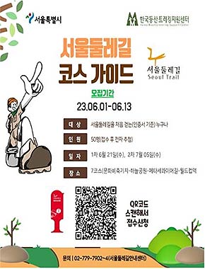 서울특별시(이하, 서울시라 함)는 누구나 즐겁게 서울둘레길을 이용할 수 있도록 서울둘레길(이하, 둘레길이라 함) 7코스에서 ‘코스가이드’ 프로그램을 운영하고 참여자를 2023.6.1.(목)부터 6.13.(화)까지 온라인으로 모집한다.