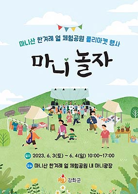 인천 강화군(군수 유천호)은 오는 3일과 4일 양일간 마니산 한겨레 얼 체험공원에서 '마니놀자' 플리마켓 행사를 진행한다.