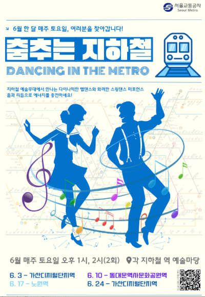 이번 6월, 서울 지하철 곳곳에서 춤꾼들의 댄스축제가 열린다. 서울교통공사(이하, ‘공사’라고 함)는 오는 6월 3일부터 24일까지 매주 토요일마다 지하철 예술마당에서 ‘춤추는 지하철(Dancing in the Metro)’ 를 개최한다고 밝혔다.