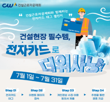 건설근로자공제회(이사장 김상인, 이하 ‘공제회’)가 7월 한달 간「건설현장 필수템, 전자카드로 더위사냥!」 이벤트를 진행한다.