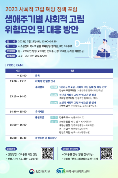 보건복지부(장관 조규홍)와 한국사회보장정보원(원장 노대명)은 7월 18일(화) 13시 서울 서소문성지 역사박물관에서「제1차 사회적 고립 및 고독사 예방 포럼」을 개최하였다.