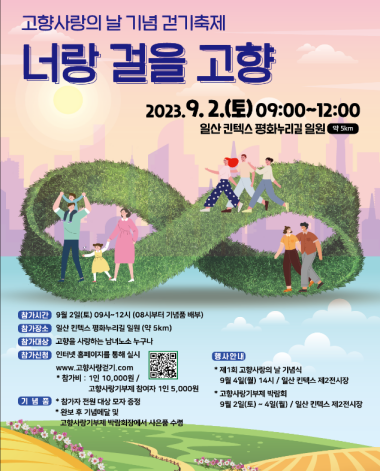 이번 ‘고향사랑의 날 기념 걷기축제’는 헹정안전부와 농협이 후원하며, ‘고향사랑기부제 박람회’ 개관일인 9월 2일(토)에 맞추어, 일산 킨텍스 평화누리길 일원(약 5㎞ 코스)에서 진행된다.