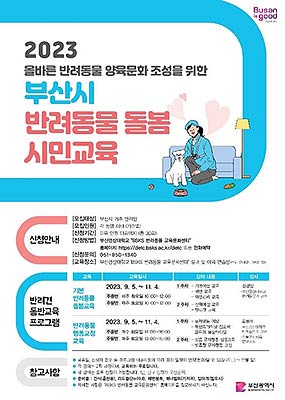 부산시(시장 박형준)는 오는 9월 5일부터 11월 4일까지 부산경상대학교 반려동물교육문화센터에서 '2023 부산시 반려동물 돌봄 시민교육'을 운영한다고 밝혔다.