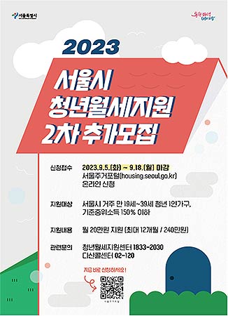 서울시는 높은 주거비로 어려움을 겪는 청년들의 부담을 덜어주기 위해 청년들에게 최대 월 20만원씩, 12개월 동안 월세를 지원하는 ‘청년월세지원’의 2차 추가모집 신청을 9.5(화) 10시~9.18(월) 18시, 2주간 서울주거포털(housing.seoul.go.kr)을 통해 접수 받는다.