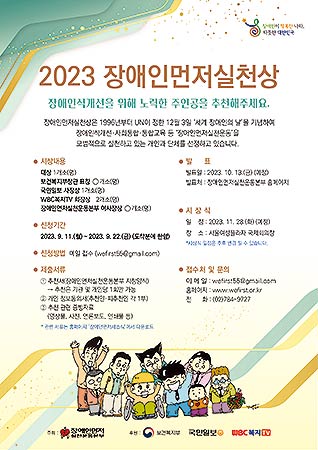 장애인먼저실천운동본부(이사장 이수성)는 ‘2023 장애인먼저실천상’ 후보(개인·단체)를 9월 11일(월)부터 22일(금)까지 접수한다.