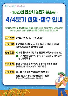 요건을 충족한 농민에게는 3개월분(10∼12월)인 15만원(월 5만원)을 안산 지역화폐 다온으로 지급한다.