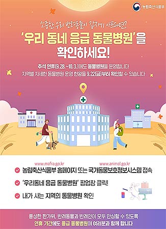 농림축산식품부(장관 정황근, 이하 농식품부)는 추석 연휴(9.28.~10.3.)에 반려동물이 갑자기 아프더라도 빠르게 진료를 받을 수 있도록 ‘우리 동네 응급 동물병원’ 정보를 농식품부 누리집(www.mafra.go.kr)에 9월 22일(금)부터 게시한다.
