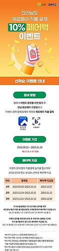 전라남도는 '제로페이' 이용 활성화를 위해 오는 11월 19일까지 '제로페이 직불결제 10% 페이백 행사'를 진행한다고 밝혔다.