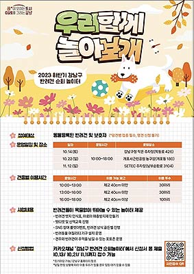 꿈이 모이는 도시, 미래를 그리는 강남구(구청장 조성명)가 10월 14일부터 11월 12일까지 하반기 반려견 순회놀이터를 무료로 3회 운영한다.