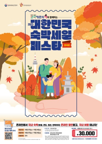 문화체육관광부(장관 유인촌, 이하 문체부)는 한국관광공사와 함께 ‘추석 연휴 깜짝 숙박세일 페스타’에 이어 올해의 마지막 ‘대한민국 숙박세일 페스타’를 진행한다.