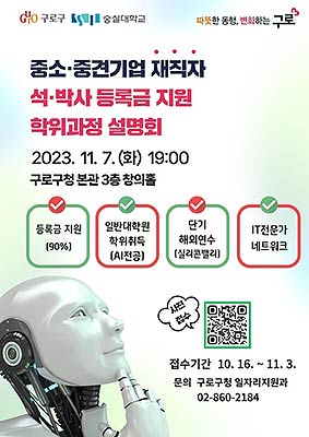 구로구(구청장 문헌일)가 내년에도 숭실대 AI테크노융합학과 석·박사과정에 지원하는 구로구 소재 기업 재직자에게 등록금의 최대 90%를 지원한다.