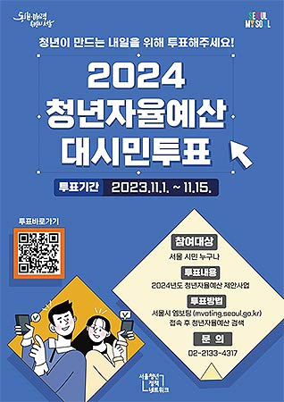 서울시가 11월 1일(수)부터 11월 15일(수)까지 2주 간 청년들이 제안한 2024년 청년자율예산 정책에 대한 시민들의 의견을 수렴하기 위해 대시민 투표를 진행한다.