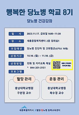 세종특별자치시 고혈압·당뇨병 등록교육센터(센터장 송영신)가 당뇨병 환자 및 고위험군을 대상으로 '제8기 행복한 당뇨병 학교' 행사를 개최하기로 하고 시민 참여자 70명을 모집한다.