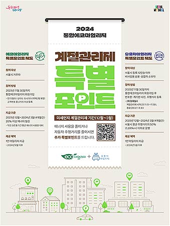 또한, 서울시는 겨울철 고농도 미세먼지를 줄이기 위해 매년 12월부터 이듬해 3월까지 시행하는 미세먼지 계절관리제 기간 동안 「’24년 동절기 에코마일리지 단체회원 에너지절약 경진대회」를 개최한다.