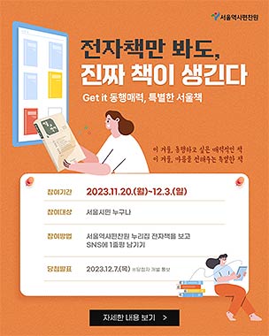 서울역사편찬원(원장 이상배)은 11.20.(월)~12.3.(일) 기간 동안 누리집(홈페이지)에서 제공 중인 전자책을 대상으로 이벤트를 진행한다. 편찬원 누리집의 전자책을 보고, 본인의 누리소통망(SNS)채널에 한줄평과 함께 인증사진을 남기면 추첨을 통해 20명에게 실물 도서를 보내준다.