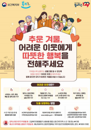 보건복지부(장관 조규홍)는 11월 22일 제31회 국정현안관계장관회의에서 추운 겨울 취약계층의 민생을 살피기 위해 「겨울철 복지위기가구 발굴·지원 대책」을 논의하였고, 그 내용은 다음과 같다.