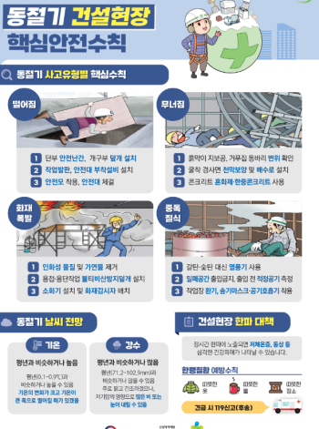 「동절기 건설현장 안전보건 길잡이」를 활용하여 겨울철 안전하고 건강한 건설현장을 위해 미리 대비해달라.”라고 당부했다.