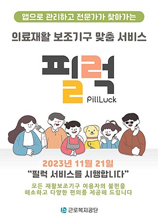근로복지공단 병원(인천병원, 안산병원 등 13개소)에서 재활보조기구 처방을 받은 산재근로자는 필력(Pill Luck) 앱(App)에서 회원가입 및 서비스 이용 동의를 완료하면 재활공학연구소 예약 서비스, 재활보조기구 유지관리 서비스, 재활보조 기구 관련 데이터 연계 및 당뇨 관리 서비스 등을 받을 수 있다.