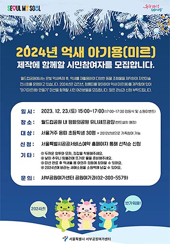서울시 서부공원여가센터는 2024년 갑진년을 맞아 12월 23일(토)부터 내년 2월 18일(일)까지 2개월간 평화의공원 유니세프광장에서 <2024, 미르(용)에게 소원을 말해봐!>를 주제로 한 제6회 억새풀 자연미술 전시를 개최하고, 억새용 제작에 참여할 2012년 용띠 초등학생 30명을 모집한다고 밝혔다.