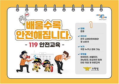 화재안전, 생활안전, 재난안전, 응급처치법으로 이루어지는 119안전교육은 전국 13개소의 소방안전체험관*을 비롯해 소방서 안전체험교실 82개소, 119안전체험차량 56대를 통해 국민 누구나 교육받을 수 있다.