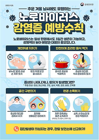 질병관리청(청장 지영미)은 노로바이러스 감염증이 최근 5년간 최고 수준으로 발생하고, 호흡기세포융합바이러스 감염증(RSV) 등 다양한 호흡기 감염병이 유행하고 있는 상황에서, 코로나19 방역 완화 이후 처음 맞는 설 연휴(2.9.~2.12.)가 다가옴을 고려하여 비상방역체계를 앞당겨서 운영한다고 밝혔다.