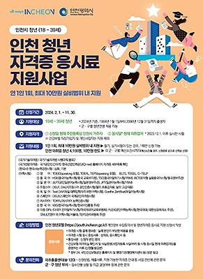 인천광역시는 취업에 어려움을 겪고 있는 인천 청년의 경제적 부담을 덜어 주기 위해 미취업 청년을 대상으로 자격증·어학시험 등 시험 응시료를 1인당 연 1회, 최대 10만 원까지 지원한다고 밝혔다.