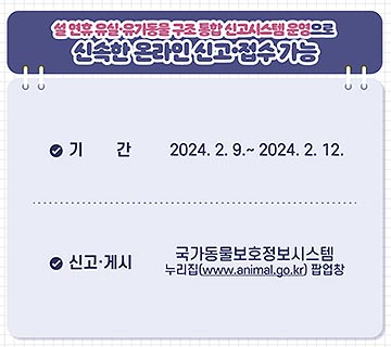 한편, 지난 추석 연휴에 이어 이번 설 연휴에도 ‘연휴 기간 운영하는 응급 동물병원’의 정보를 농식품부 공식 누리집 및 국가동물보호정보시스템에 게시한다. 지역별로 운영하는 동물병원의 명칭·주소와 운영 날짜를 확인할 수 있으며, 약 450개 동물병원이 이번 설 연휴에도 운영을 지속한다.