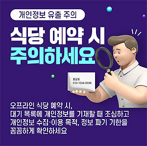 또한, 새해 모임을 위해 식당을 오프라인으로 예약할 경우, 식당에서 제공하는 공개된 공간에 비치된 대기 손님 목록에 개인정보(이름, 전화번호 등)를 기재할 때도 주의가 필요하다. 요즘은 SNS를 이용해 대기 알림 서비스를 이용하는 경우가 많지만, 아직도 많은 식당에서 수기로 예약자 명단을 받고 있다. 이때 개인정보 수집‧이용 목적, 파기 기한 등이 있는지 반드시 확인하여야 한다.