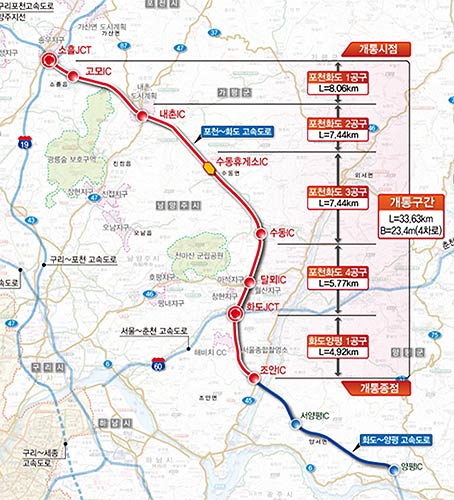 이번 개통으로 포천시 소홀읍에서 남양주시 조안읍까지의 이동거리는 약 16㎞ 감소(50.0㎞→33.6㎞)하고, 주행시간은 약 30분 단축(55분→20분)될 것으로 예상된다.