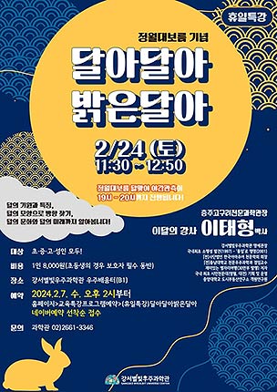 서울 강서구(구청장 진교훈)는 오는 24일 강서별빛우주과학관에서 휴일 특강 '달아달아 밝은달아'를 진행한다고 밝혔다.