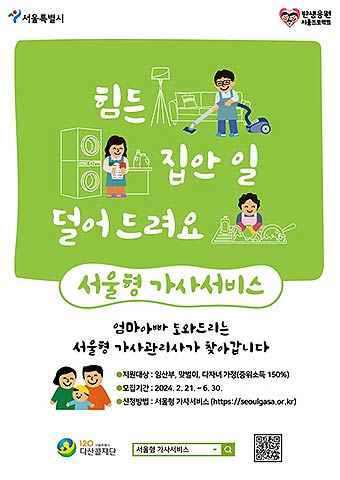 서울시는 오는 2월21일(수) 오전 10시부터 6월30일(일)까지 약 4개월 동안 ‘서울형 가사서비스’ 수시로 신청을 받는다. 실제 서비스 이용은 3월부터 시작한다.