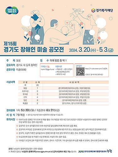경기도장애인복지종합지원센터(이하 누림센터)가 3월 20일부터 5월 3일까지 ‘제15회 경기도 장애인 미술 공모전’의 작품을 공모한다.