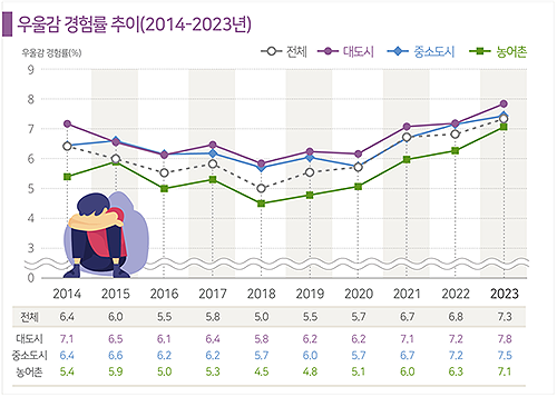 우리나라 성인의 우울감 경험률은 ’18년 5.0%로 최저를 기록한 이후 코로나19 유행을 겪으며 지속적으로 증가하여 ’23년 7.3%이었다. 감소 경향을 보이던 우울감 경험률은 2020년부터 2023년까지 지속된 코로나19 유행 기간과 겹쳐 증가하고 있어, 코로나19 장기화로 인해 나빠진 정신건강이 일상 회복 이후에도 아직 회복되지 못하고 있는 것으로 의심된다. 또한 대도시의 우울감 경험률이 농어촌에 비해 높은 경향을 보였는데, 도시와 농촌지역의 물리적 환경과 지역사회 교류 기회 등 여러 요인의 차이로 추정해 볼 수 있다.