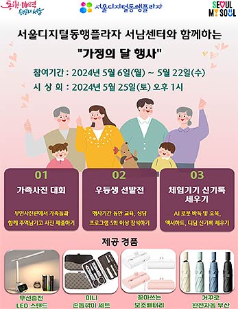 서울시는 5.6.(월)~5.22.(수) 서울디지털동행플라자 서남센터(영등포구 대림동)에서 ‘가족사진 대회’, ‘우등생 선발전’, ‘디지털 체험기기 신기록 경신’ 등 장노년층 대상 프로그램을 진행한다고 밝혔다.