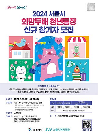 서울시는 6.10.(월)~6.21.(금) 일하는 청년들의 씨앗자금 조성과 미래 설계를 돕는 ‘희망두배 청년통장’ 신규참여자 1만 명을 모집한다고 밝혔다. 같은 기간, 만 14세 이하 자녀의 교육자금을 모으는 ‘꿈나래 통장’ 신규참여자 300명도 모집한다.